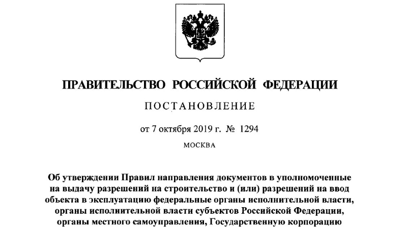 «Төзелешкә рөхсәтләр һәм (яки) объектны файдалануга тапшыруга рөхсәтләр бирү өчен вәкаләтле башкарма хакимиятнең федераль органнарына, Россия Федерациясе субъектларының башкарма хакимият органнарына, җирле үзидарә органнарына, «Росатом» атом энергиясе буенча Дәүләт корпорациясенә, «Роскосмос» космик эшчәнлек буенча Дәүләт корпорациясенә электрон формада документлар җибәрү Кагыйдәләрен раслау турында» 2019 елның 7 октябрендә чыккан 1294 номерлы РФ Хөкүмәте карары