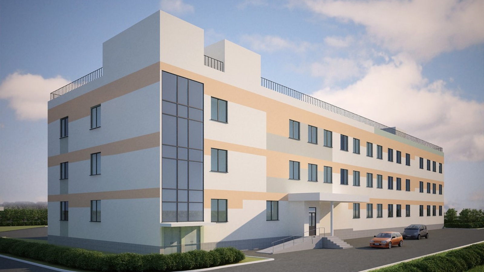 Гомуми мәйданы 3441 кв. м булган өч катлы бина үз эченә түбәндәге әйберләрне ала: