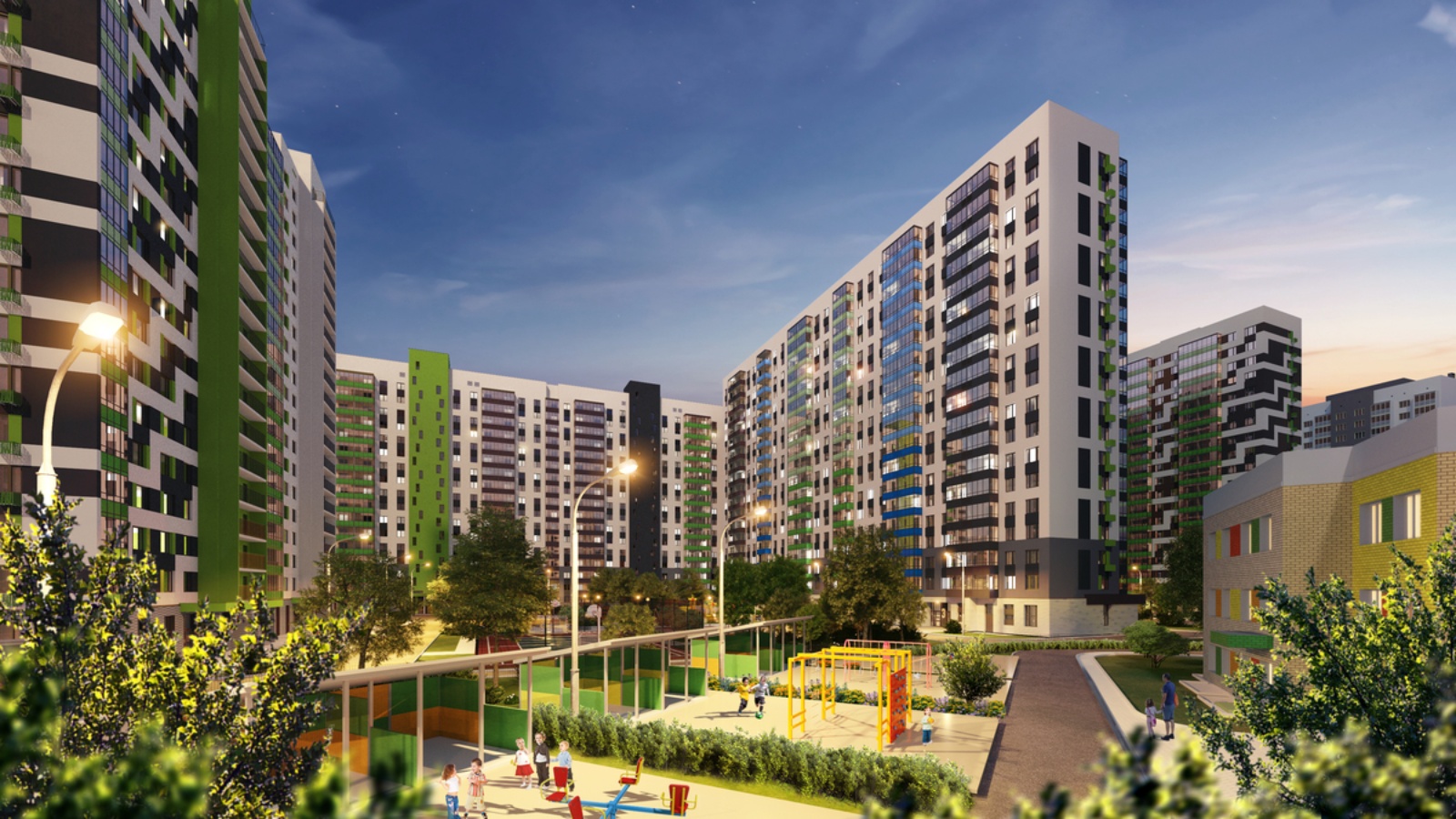 Территориядә өлкәннәр өчен ял итү урыннары, комлы катламлы балалар өчен уен мәйданчыклары, махсус резин өслекле спорт-физкультура мәйданчыклары, хуҗалык мәйданчыклары, шулай ук кече архитектура формалары урнаштырыла.
